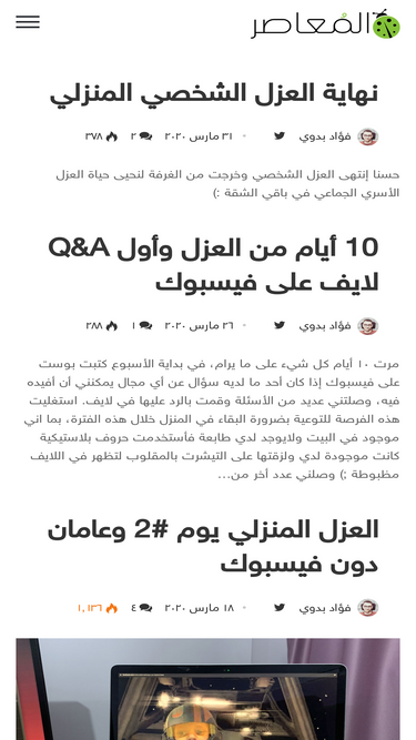 100%مرت ١٠ أيام كل شيء على ما يرام، في بداية الأسبوع كتبت بوست على فيسبوك إذا كان أحد ما لديه سؤال عن أي مجال يمكنني أن أفيده فيه، وصلتني عديد من الأسئلة وقمت بالرد عليها في لايف. استغليت هذه الفرصة للتوعية بضرورة البقاء في المنزل خلال هذه الفترة، بما اني موجود في البيت ولايوجد لدي …