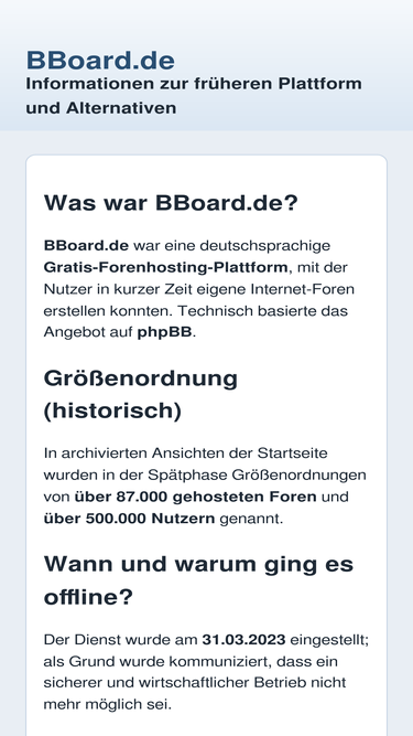 bboard.de stellt ihnen ein kostenloses forum für ihre community zur verfügung. inklusive phpbb software, schneller hilfe bei problemen und regelmässige backups ihrer foren.