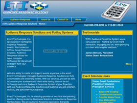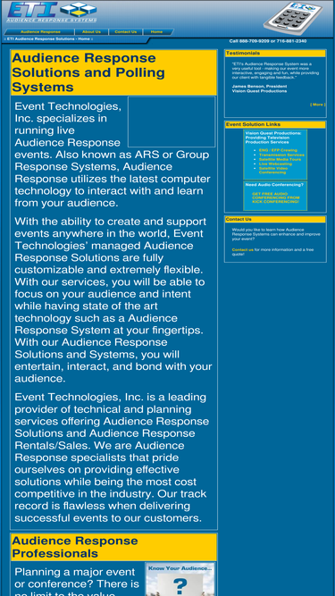 99%the go-to audience response solution provider, since 1997, event technologies provides audience response solutions for live meetings, conferences, special events and continuing education. cost effective, professional execution for every budget. interactive gameshows, cme, cle, association meetings, focus groups, advisory boards, speaker training, sales training, town halls, voting, polling, speaker evaluations and marketing focus groups. call today at 1-888-709-9209 (716-881-2340)