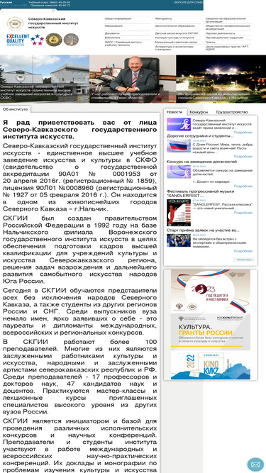 77%северо-кавказский государственный институт искусств - единственное высшее учебное заведение культуры в регионе. он находится в одном из живописнейших городов северного кавказа – г.нальчике. скгии был создан правительством российской федерации в 1992 году на базе нальчикского филиала воронежского государственного института искусств в целях обеспечения подготовки кадров высшей квалификации для учреждений культуры и искусства северокавказского региона, решения задач возрождения и дальнейшего развития самобытного искусства народов юга россии.
