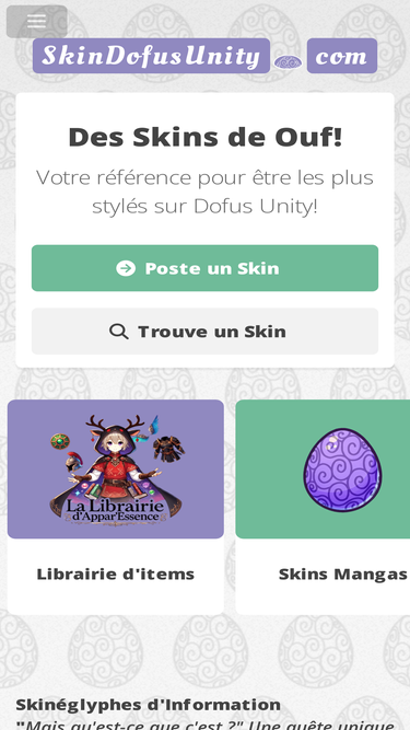 94%Bienvenue sur le site référence pour trouver des inspirations sur vos skins Dofus ! Tous les skins Dofus présents sont donnés avec leurs codes couleurs ainsi que leurs items associés.
