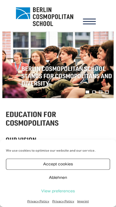 67%Angaben gemäß § 5 TMG: EBS Europäische Bildungsstiftung gGmbH Rückerstrasse 9 10119 Berlin Vertreten durch: Yvonne Wende Kontakt: Telefon: +49 (0) 30 688 33 23 0 Telefax: +49 (0) 30 688 33 23 23 Email: office@cosmopolitanschool.de Registereintrag: Eintragung im Handelsregister. Registergericht: Amtsgericht Berlin Charlottenburg Registernummer: 105640B Umsatzsteuer-Identifikationsnummer gemäß §27a Umsatzsteuergesetz: 27/603/53052 Aufsichtsbehörde: Senat für Bildung,