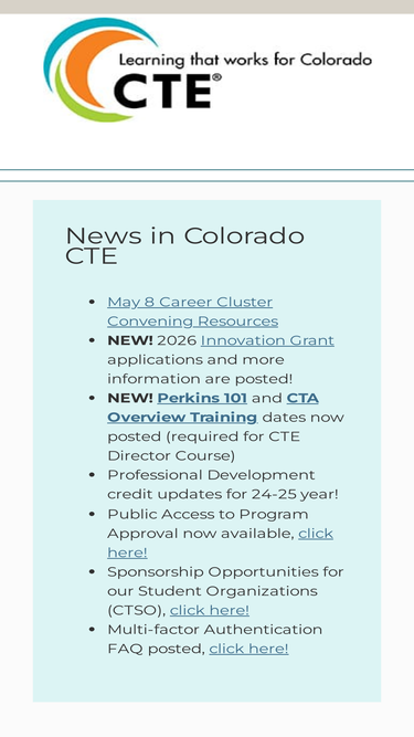 99%Please note that as of January 5, 2026, coloradostateplan.com will forward to our new CTE website cteincolorado.org. May 8 Career Cluster Convening Resources NEW! 2026 Innovation Grant applications and more information are posted! NEW! Perkins 101 and CTA Overview Training