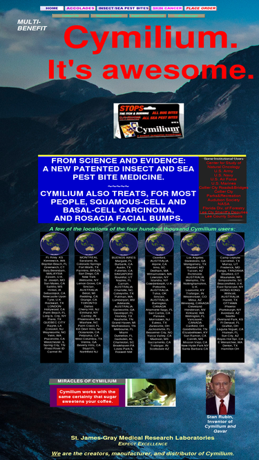 cymilium eliminates the itch or burning from all insect and sea pest bites within 30 seconds to 4 minutes by applying it just once: mosquitoes, no-see-ums, bees, wasps, black flies, horse flies, deer flies, fire ants, red ants, caterpillars, jellyfish, sea lice, ticks, lice, sting rays, catfish,yellow jackets,man-o-war, snorkeling, stingrays, hornet, itch, anti-itch, venom, anti-venom, portuguese, sand flies, wrinkles, scars, wounds, beach, surf, ocean, bugs, camping, fishing, hunting, baseball, summer, hiking, backpacking, diving, sea diving, travel, tourist, florida, california, georgia, texas, alabama, army, navy, air force, nasa, audubon society, conservancy, sports, cycling, bicycle, football, tennis, golf, croquet, cruises, west nile virus