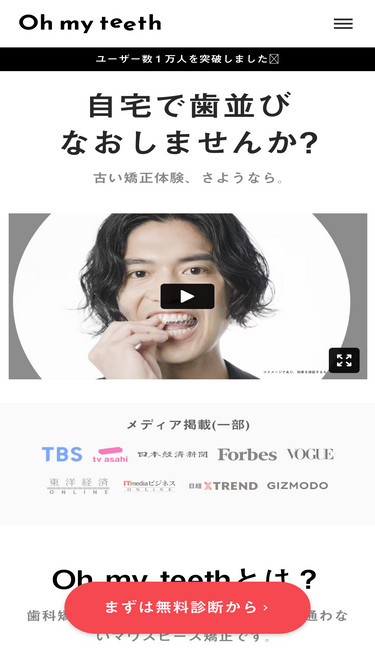 80%Oh my teethは国内マウスピース矯正ブランド製造数No. 1。通院不要・短期間・リーズナブルな新時代のマウスピース矯正です。期間は最短2ヶ月、税込3,500円〜/月で始められます。