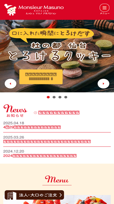100%仙台・石巻のサンタのいるケーキ屋さん ムッシュ マスノ アルパジョン。大人気「くまの手シューラスク」「アップルポテト」などこだわりのスイーツをお届けしています。「アップルポテト」などこだわりのスイーツをお届けしています。