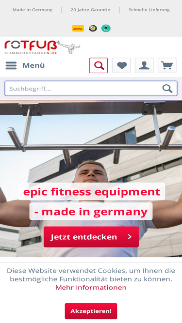 87%Klimmzugstangen Konfigurator Du willst Klimmzüge machen? Stelle mit diesem Klimmzugstangen-Konfigurator deine Klimmzugstange für die Decke zusammen! Das hier ist unser Klimmzugstangen-Konfigurator für D-Modelle. Stelle damit eine Klimmzugstange für die Decke nach deinen Wünschen und Bedürfnissen zusammen. Wichtige Auswahlmöglichkeiten: Wähle zunächst das Grundmodell aus: vier, zwei oder keine Zusatzgriffe. Lege den gewünschten Abstand von der Decke fest – möglich sind 300 mm, 350 mm, 400 mm bis 650 mm. Der Deckenabstand bezieht sich auf die Gesamtlänge der Strebe, in die die Stange eingefügt und verschweißt wird. Bei einer Strebe von 300 mm ergibt sich ein genauer Deckenabstand von 268 mm zwischen der Decke und der Oberkante des Rohrs. Wir sprechen hier immer vom geraden Teil der Klimmzugstange. Das Ende der gebogenen Stangenabschnitte liegt etwa 100 mm tiefer. Wähle die Breite der Klimmzugstange: 1180 mm oder 1080 mm. Bestimme die Biegung der Enden: 30° gebogen oder gerade. Wähle die Anzahl der Ösen: ohne Öse, 1 Öse Mitte, 2 Ösen oder 3 Ösen. Produktdetails: Material: hochwertiger, rostbeständiger Edelstahl Design: praktisch, schnörkellos, klar und minimalistisch Konstruktion: extrem robust, vollverschweißt – kein Zusammenbauen erforderlich Rohrenden: mit passenden Sichtstopfen versehen Belastung: bis 500 kg 20 Jahre Garantie auf Schweißnähte (mehr auf Anfrage) Maße: Breite x Tiefe x Höhe: 108 oder 118 cm x 29 cm x 38 cm Rohr-Durchmesser: Ø 30 mm Maximale Griffweite: 108 oder 118 cm Länge Zusatzgriffe/Parallelgriffe: 13 cm Abstand zwischen Parallelgriffen: 23 cm oder 60 cm Befestigungsplatten: Ø 150 mm, mit jeweils 4 Bohrungen Durchmesser Bohrungen für Schrauben: Ø 10 mm Technische Details: Zustand: neu Hergestellt in: Deutschland Anzahl der Einzelteile: 1 Teil Konstruktion: vollverschweißt Anzahl Bohrungen für Schrauben: 8 Stück, Ø 10 mm Oberfläche: geschliffen, Korngröße 240 Farbe: silber Gewicht: 8 kg Zusätzliche Information Wie Montagehöhe ermitteln