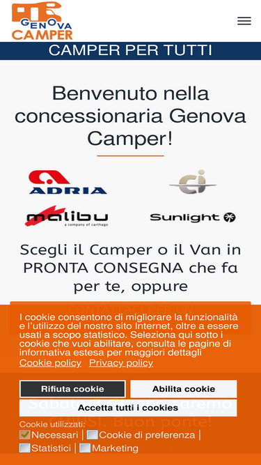 97%Genova Camper è il punto di riferimento in Liguria per chi vuole acquistare un camper di qualità. Siamo concessionari per Adria, CI, Malibu e Sunlight