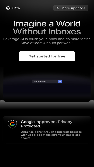 93%Imagine a world without email inboxes. That's Ultra. The future of email, built from the ground up using Artifical Intelligence, designed to save you at least 4 hours per week.