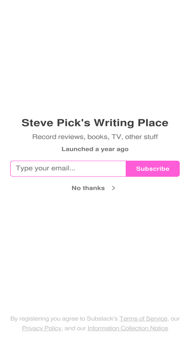 100%Record reviews, books, TV, other stuff. Click to read Steve Pick's Writing Place, a Substack publication with hundreds of subscribers.