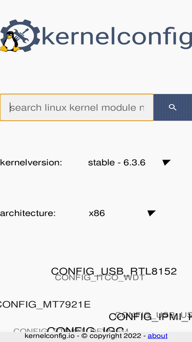 100%kernelconfig.io allows searching of kernel modules/ kernel configuration. dependencies and automatically selected kernel modules/builtins are displayed. when possible direct links to source files in kernel repository are displayed.