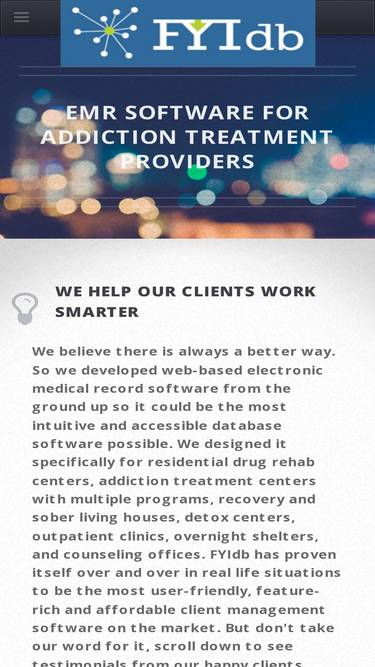 84%fyidb is web-based emr software specifically designed for the addiction treatment and drug rehab industry. it allows organizations to securely store and access information and allows staff to communicate more efficiently.