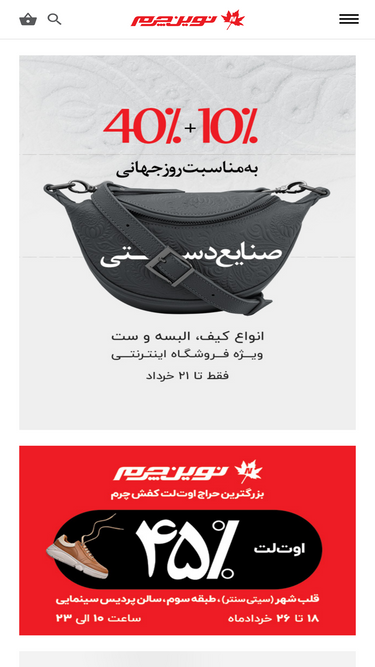 84%خرید اینترنتی انواع کیف و کفش چرمی مردانه و زنانه از برند نوین چرم | انتخاب بهرام رادان و بهنوش طباطبایی همین الان سفارش دهید. شیک ترین و جدیدترین محصولات چرمی شامل کت چرم ، کلاه و کمربند | تخفیف ویژه در جشنواره ها | عضویت در باشگاه مشتریان نوین چرم.