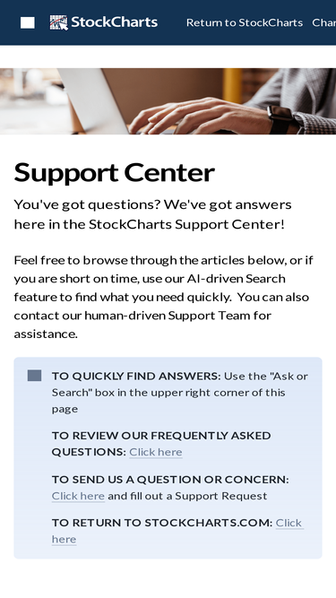 94%the support center for stockcharts.com includes answers to frequently asked questions, in-depth articles about our charting tools and resources, and more.