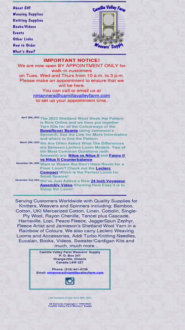 100%supplies for both knitters and weavers including: cotton, mercerized cotton, linen, orlec, cottolin, wool, lopi, tartan yarn, bamboo, rayon chenille, fleece artist, peace fleece, jaggerspun zephyr in a rainbow of colours as well as leclerc weaving looms and accessories, inox, addi turbo and susan bates needles, eucalan, books, videos, fair-isle sweater/cardigan kits and much, much more...