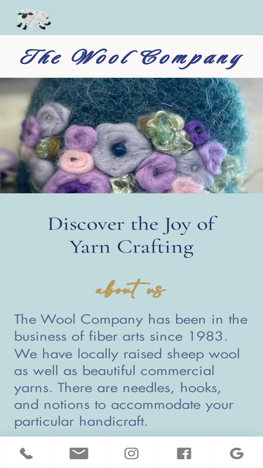 100%The Wool Company has been in the business of fiber arts since 1983. We have locally raised sheep wool as well as beautiful commercial yarns. There are needles, hooks, and notions to accommodate your particular handicraft.
