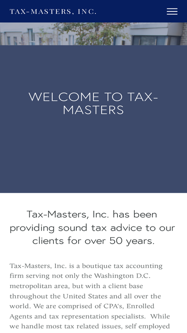 84%Tax-Masters, Inc. is a boutique tax accounting firm serving not only the Washington D.C. metropolitan area, but with a client base throughout the United States and all over the world. We are comprised of CPA's, Enrolled Agents and tax representation specialists.
