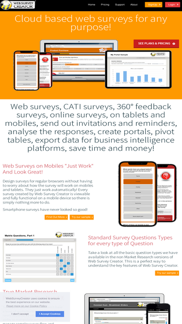 100%web survey creator, create surveys with powerful functionality, respondent logins, data validation and flow control, produce a vast array of reports.