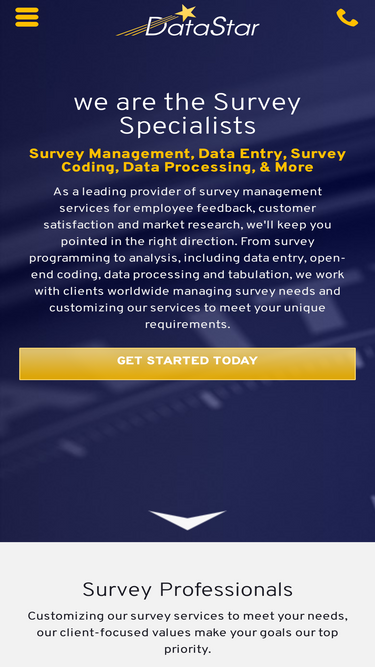 98%at datastar we offer survey management, data entry, survey coding, data processing, employment engagement surveys and more. specializing in employee engagement surveys, 360 feedback programs, as well as market research, online and traditional mail surveys. for data collection, tabulation and data analysis, contact us today to get started.
