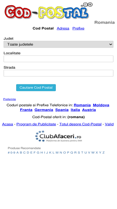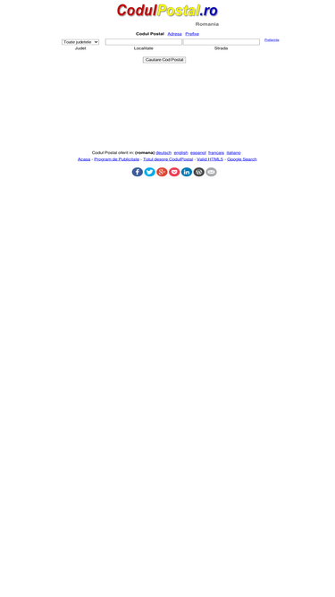 Cod Postal Romania - Zip Code Romania - Lista coduri postale din Romania. Cod postal, judet, localitate, strada. Bucuresti, Iasi, Cluj, Brasov, Prahova, Arges, Bacau.