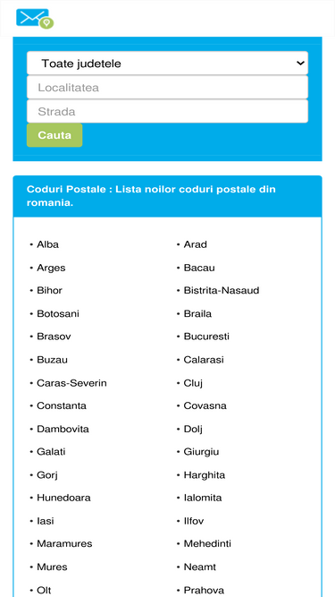 79%Cauta un cod postal pentru o adresa, localitate sau strada ? Lista completa coduri postale din Romania pentru fiecare comuna, sat, oras, judet.