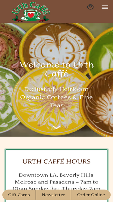 89%Urth Caffé in Orange, CA. We are a European-style café— a casual, comfortable experience with no waiters. Please place your order with the cashier, find a table, and it will be our pleasure to bring it out to you!