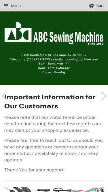 98%ABC Sewing Machine is the premier supplier of industrial/domestic sewing machines and garment accessories in the Los Angeles area. View our wide selection of parts & equipment today. Don't see what you're looking for? Give us a call 213.747.9555 or email sales@abcsewingmachine.com