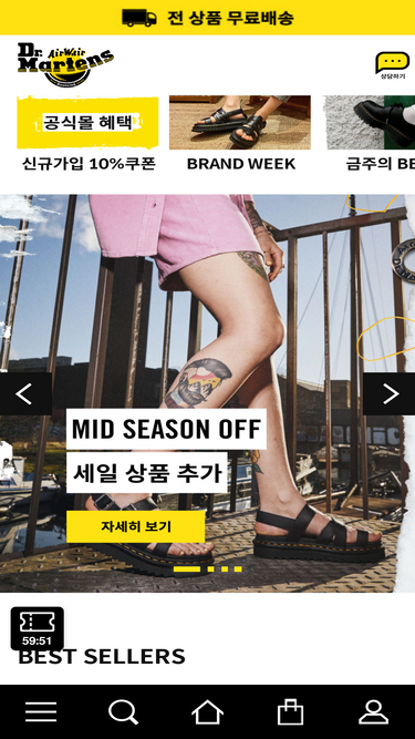 68%영국 60년 정통 패션 브랜드 공식스토어, 1460, 1461 오리지널 아이콘으로 대표되는 부츠,슈즈, 샌들 등 신제품 정보, 콜라보레이션, 멤버십 혜택, 브랜드 스토리, 매장 안내
