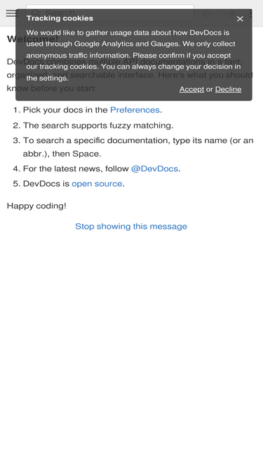89%Fast, offline, and free documentation browser for developers. Search 100+ docs in one web app including HTML, CSS, JavaScript, PHP, Ruby, Python, Go, C, C++, and many more.