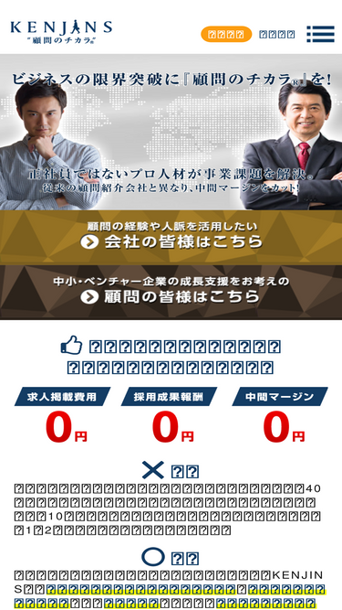 89%顧問紹介なら業界n.1の低コストで中間マージン無しの「kenjins」へ。成果報酬型で複数の営業顧問が大手企業の役員とのアポイントを実現。顧問のチカラで社員では難しい経営課題をリーズナブルに解決します。