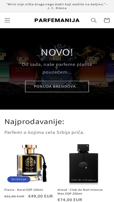 58%Parfemanija.com nudi najširu ponudu autentičnih parfema sa garancijom u Srbiji po sniženim cenama. Kupujte najprodavanije parfeme, poslednje novitete, vanvremenske klasike i još mnogo proizvoda od vrhunskih brendova kao što su Armaf, Versace, Flavia, Mancera, Tom Ford, Montale, Amouage i ostali.
