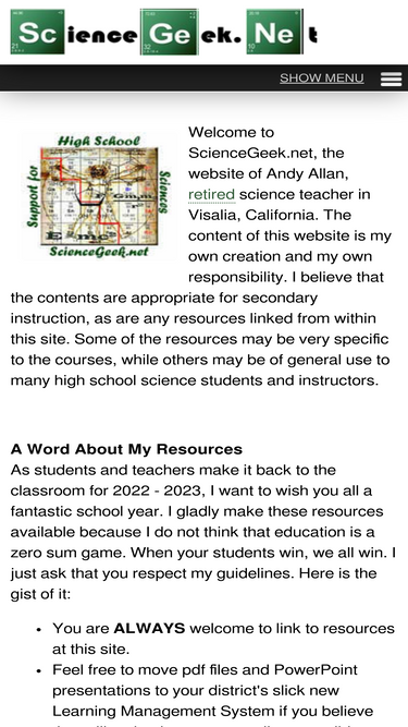 79%support for high school science courses, including chemistry, ap chemistry, and biology. sciencegeek.net is the website of andy allan, a retired science teacher in visalia, ca.