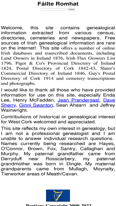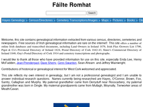 site contains information about irish genealogy, pigot's directory, lewis topographical directory, guy's postal directory for cork, griffiths valuation extracts for cork, cavan, kerry & meath. landowners of ireland 1876