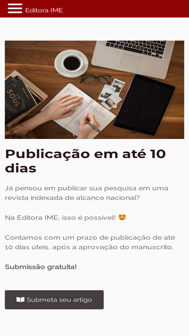 100%publicação em até 10 dias já pensou em publicar sua pesquisa em uma revista indexada de alcance nacional? na editora ime, isso é possível! 🤩 contamos com um prazo de publicação de até 10 dias úteis, após a aprovação do manuscrito. submissão gratuita! submeta seu artigo sobre nós a editora ime é a proposta editorial … início leia mais »