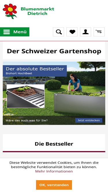 Ein Blumenmarkt Dietrich Geschenkgutschein ist das ideale Geschenk für jeden Anlass. Die Beschenkten erhalten nicht nur eine Riesenauswahl aus unserem umfangreichen Sortiment, sondern auch ein Einkaufserlebnis der besonderen Art auf über 25’000 m². Der Gutschein ist einlösbar im: - Garden Center und Garden Trends Lifestyle in Gampelen - Garden Center Salvenach - Garden Outlet XXL Die Geschenkgutscheine können auf Wunsch auch den Beschenkten direkt geschickt werden. Sollten die vorausgewählten Gutscheinbeträge nicht passen, dann bitten wir Sie, uns direkt per Telefon (032 313 13 06) oder E-Mail (shop@blumenmarkt.ch) zu kontaktieren. Gerne werden wir Ihnen unmittelbar einen Gutschein mit dem gewünschten Betrag erstellen.