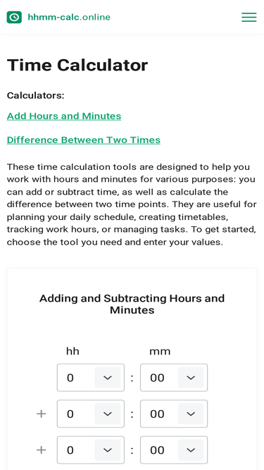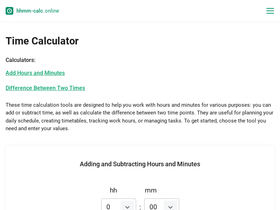 47%Hours and minutes calculator: add and subtract time, calculate the difference between two time points. A convenient tool for accurate time calculations.