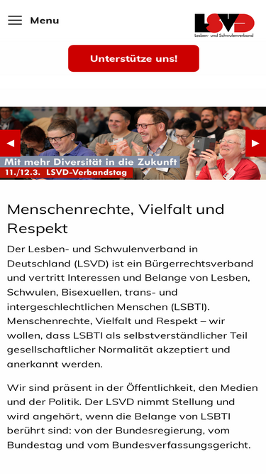 92%der lsvd⁺ – verband queere vielfalt vertritt interessen von lesben, schwulen, bisexuellen, trans- und intergeschlechtlichen menschen sowie queeren (lsbtiq*). wir wollen, dass lsbtiq* als selbstverständlicher teil gesellschaftlicher normalität akzeptiert und anerkannt werden.