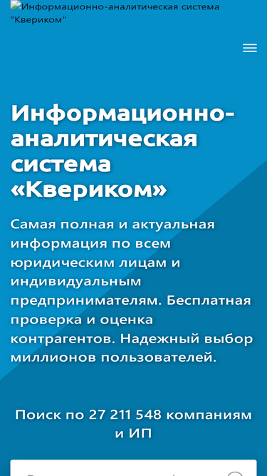 76%Информационно-аналитическая система "Квериком". Самая полная и актуальная информация по всем юридическим лицам и индивидуальным предпринимателям. Бесплатная проверка и оценка контрагентов. Надежный выбор миллионов пользователей.