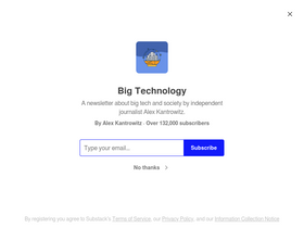 59%A newsletter about big tech and society by independent journalist Alex Kantrowitz. Click to read Big Technology, by Alex Kantrowitz, a Substack publication with hundreds of thousands of subscribers.
