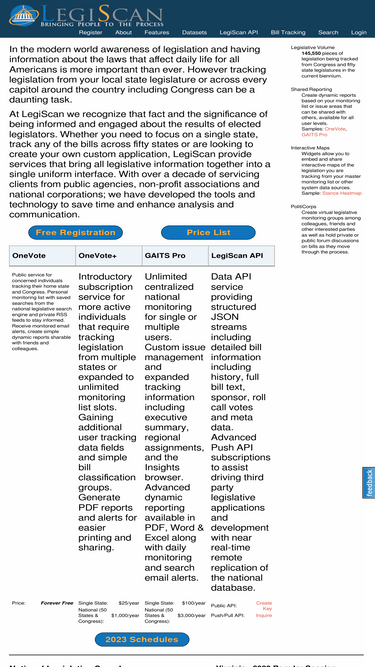 97%LegiScan national legislative monitoring, reporting and API data services. Tracking legislation in all 50 states, DC Council and US Congress. Free public service and professional support accounts.
