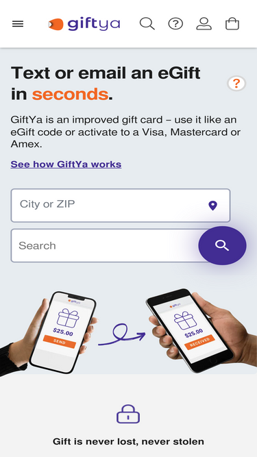 Looking for e-Gift cards? GiftYa has e-Gift cards for most merchants in the US through a revolutionary gifting site! Text a Gift Card in seconds now - GiftYa.