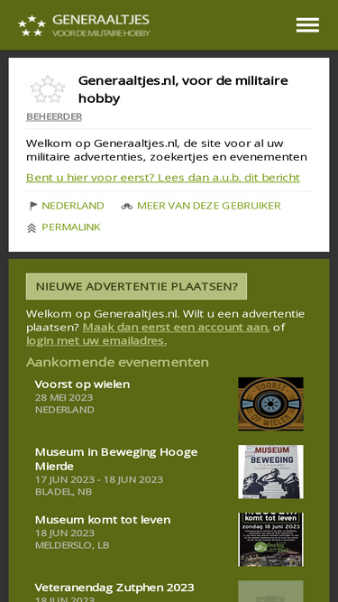69%Welkom op Generaaltjes.nl, de site voor al uw militaire advertenties, zoekertjes en evenementen Let op, oplichter(s)! Wij ontvangen regelmatig berichten van een oplichter die zich als Fransoos voordoet. Er worden daarbij verschillende namen gebruikt. Werkwijze als volgt: Vraagt eerst om foto's, en geeft aan dat hij niet langs kan komen maar wel zonder zicht wil kopen. Daarna of u eerst een bedrag van 300-400 euro naar hem wil overboeken om het krediet vrij te maken om een regeling. Een en ander gaat gepaard met een kopie van een ID bewijs en officieel lijkende documenten van het Ministerie van Economie van Frankrijk. Wees a.u.b. waakzaam hiermee, en lees ook de andere tips uit de link hierboven. Update januari 2024. Deze oplichter is weer/nog steeds actief. Wees op uw hoede! Contact Heeft u vragen, opmerkingen, ideeën of wilt een probleem melden waar u tegen aan loopt? Deze kunt u sturen naar generaaltjes@dpa-holland.nl. NB. Richt u vragen over advertenties a.u.b. aan de plaatser van de advertentie! Voor hulp kunt u op deze pagina terecht NB2. Komen onze emails niet aan? Kijkt u a.u.b. in uw ongewenste mail. Let hierop als u een account probeert te activeren. NB3. HEEFT U EEN VRAAG OVER EEN ADVERTENTIE? NEEM CONTACT OP MET DE ADVERTEERDER. ZOEKT U IETS? PLAATS EEN ADVERTENTIE. WIJ ZIJN SLECHTS EEN FACILITEREND PLATFORM TUSSEN VERKOPERS EN KOPERS Met vriendelijke groet, Nico Wolters (DPA-Holland) Enkele tips om fraude te voorkomen - Google de naam, emailadres, andere gegevens van de verkopende partij, om te zien of er niet eerder mensen gescammed zijn. - Koop op zicht. Of vraag minstens of het mogelijk is om langs te komen. Accepteer geen smoesjes. - Wees bedacht op banktransacties naar buitenland, helemaal wanneer er banken als Western Union in het spel zijn - Als u als verkoper
