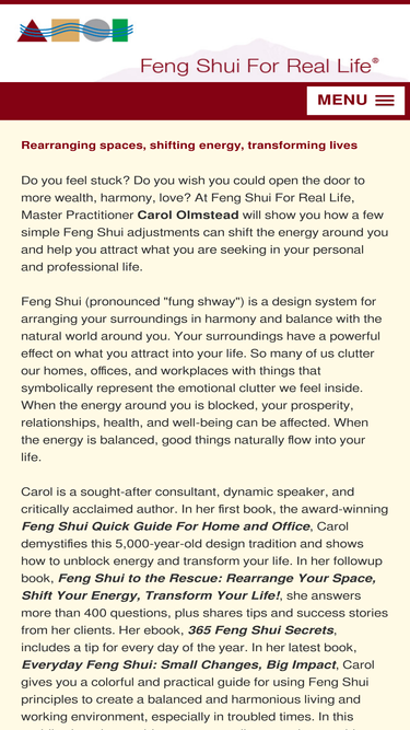86%welcome to feng shui for real life. carol olmstead, feng shui master practitioner offers feng shui consulting for home, office and business, classes, tips, webinars, and books.