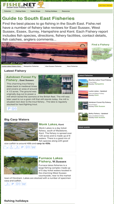 find great fisheries and fishing lakes to fish in east sussex, west sussex, essex, surrey and kent. with 100's of fishing lakes and fishery reviews to help find where to go fishing, along with fishing clubs, tackle shops, fishing holidays, carp, pike, match and trout angling sections.