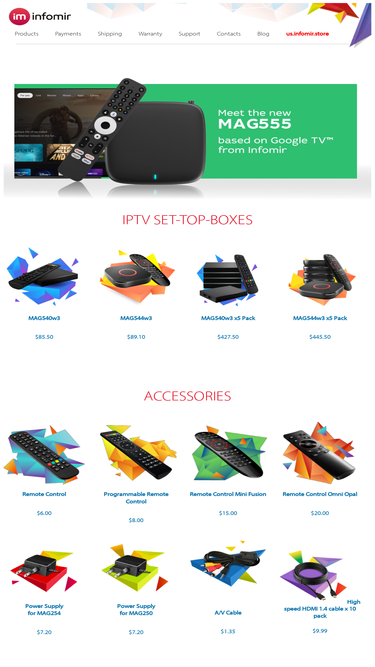 The product you selected is Out Stock. You can choose new models of MAG boxes on our official website us.Infomir.store --- wider variety of models ENJOY HIGH-QUALITY IPTV CONTENT AT AN AFFORDABLE PRICE WITH MAG420 The IPTV Set-Top box MAG420 is perfect for people who want to watch video content in the highest quality. Thanks to this device, you can enjoy an unmatchable Ultra HD picture at 60 FPS framerate combined with 6-channel Dolby Digital audio. STANDARD SET To start using the STB, no additional purchases are required: the device comes pre-equipped with a user manual, a power adapter, an HDMI 2.0 cable, and a remote control with 2 AAA batteries. We do our best to make sure you get the most out of your purchase! <img alt="" src="/f/420_UHD.p