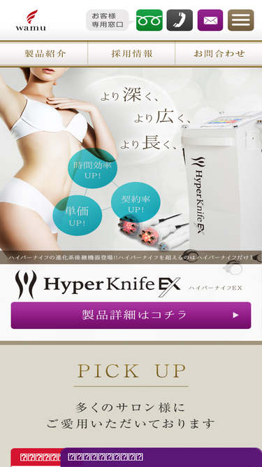 85%サロン開業にもおすすめ!株式会社ワムのハイパーナイフは高周波による「温め」と特殊ハンドピースによる「ほぐし」で脂肪を撃退する優良認定店エステ機器です。10分の施術でも目に見えるほどの効果があらわれ、購入された多くの方から喜びの声をいただいております。フランチャイズ加盟も募集中です!