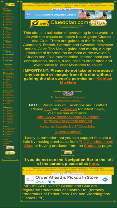 90%cluedo and clue aren't just boardgames! merchandise pages, cluedo television series and movie media, game rules, interactive murder mysteries and international information.