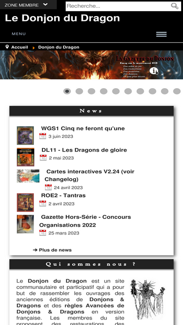 85%Le Donjon du Dragon est un site communautaire et participatif qui a pour but de rassembler les ouvrages des anciennes éditions de Donjons & Dragons et des règles Avancées de Donjons & Dragons en version française (OD&D à AD&D2.5). Par le biais de discussions et d'une gratuité totale, les membres du site proposent des restaurations, des traductions exclusives et de nombreuses créations. Vous trouverez également les règles de ces différents systèmes en format numérique dans le DRS.