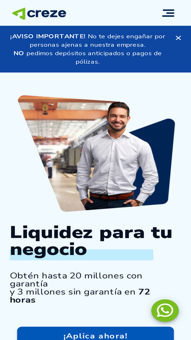 98%¿Listo para dar el siguiente paso con tu Empresa/Negocio? En Creze te damos hasta 10 Millones en 72 Horas. Simula tu Crédito.