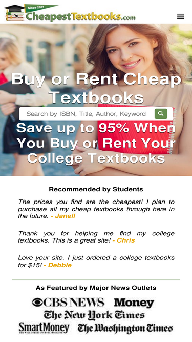 90%Save a ton of money on your textbooks using our FREE CheapestTextbooks.com textbook price comparison site. It's both fast and easy to use.
